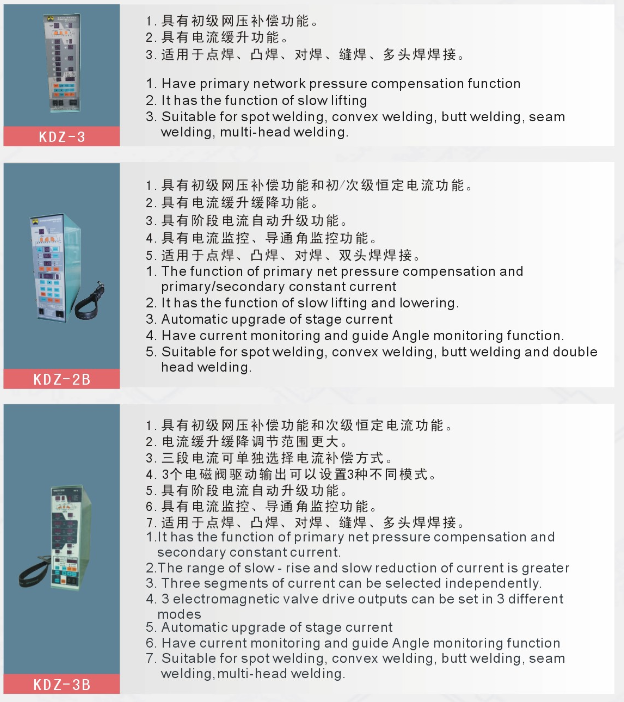 KDZ-2B是我司研發的新型微電腦電阻焊控制器。主要用于單相交流,次級整流點(凸)焊機、對焊機、雙頭焊機,每個循環可以完成從加壓,焊接1,冷卻1,緩升,焊接2,冷卻2,焊接3,維持,休止程序(多脈沖)。